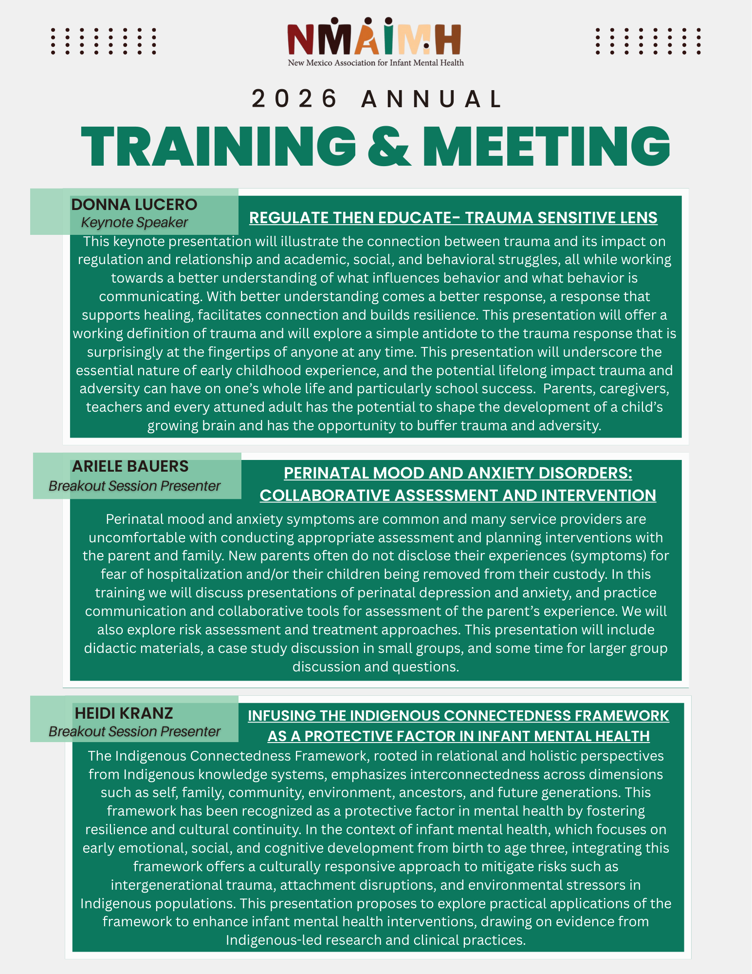 Stay informed about the latest training opportunities, events, and board announcements from the New Mexico Association for Infant Mental Health! Sign up to receive updates straight to your inbox and stay connected with important news, professional development opportunities, and ways to engage with our community. Sign up today!